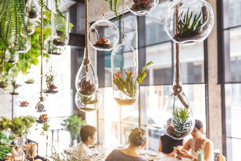 スペースに制限がある場合は、観葉植物を天井から吊るしたり、ウォールグリーンを導入する方法もあります。